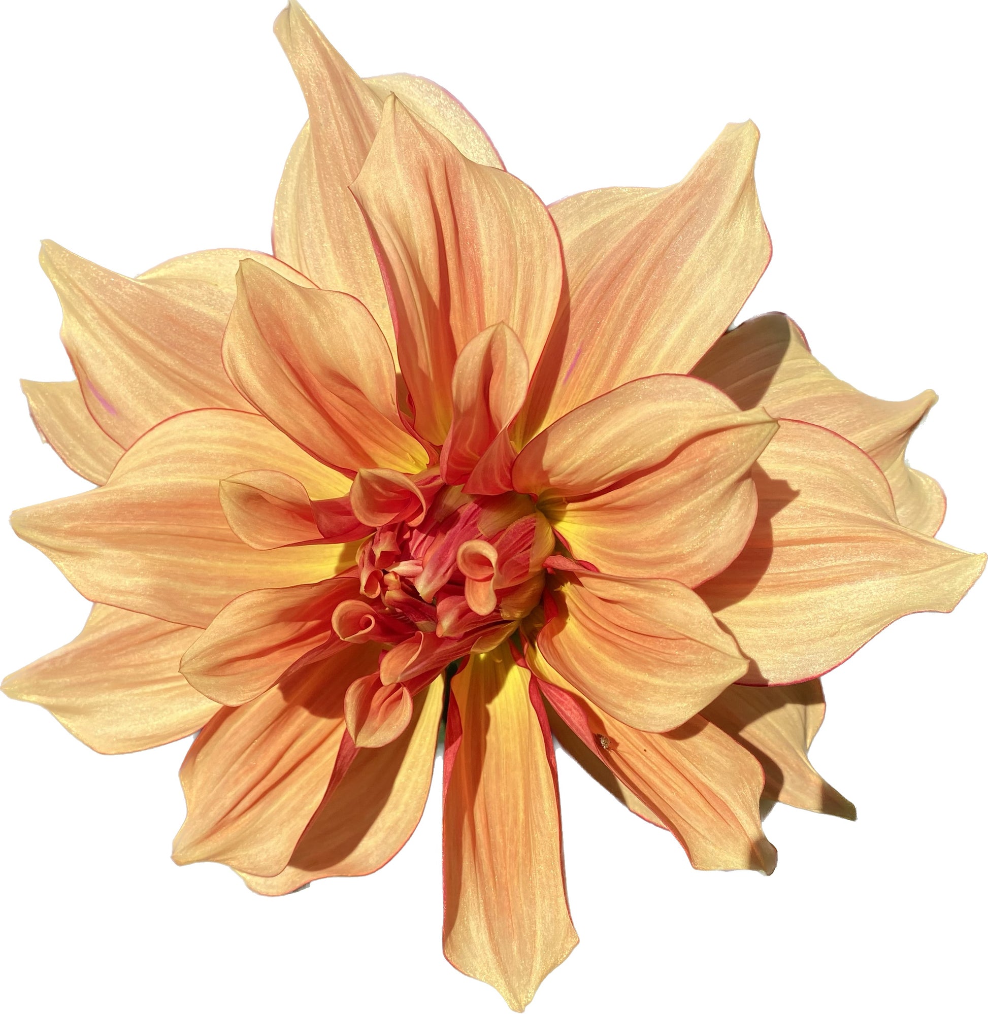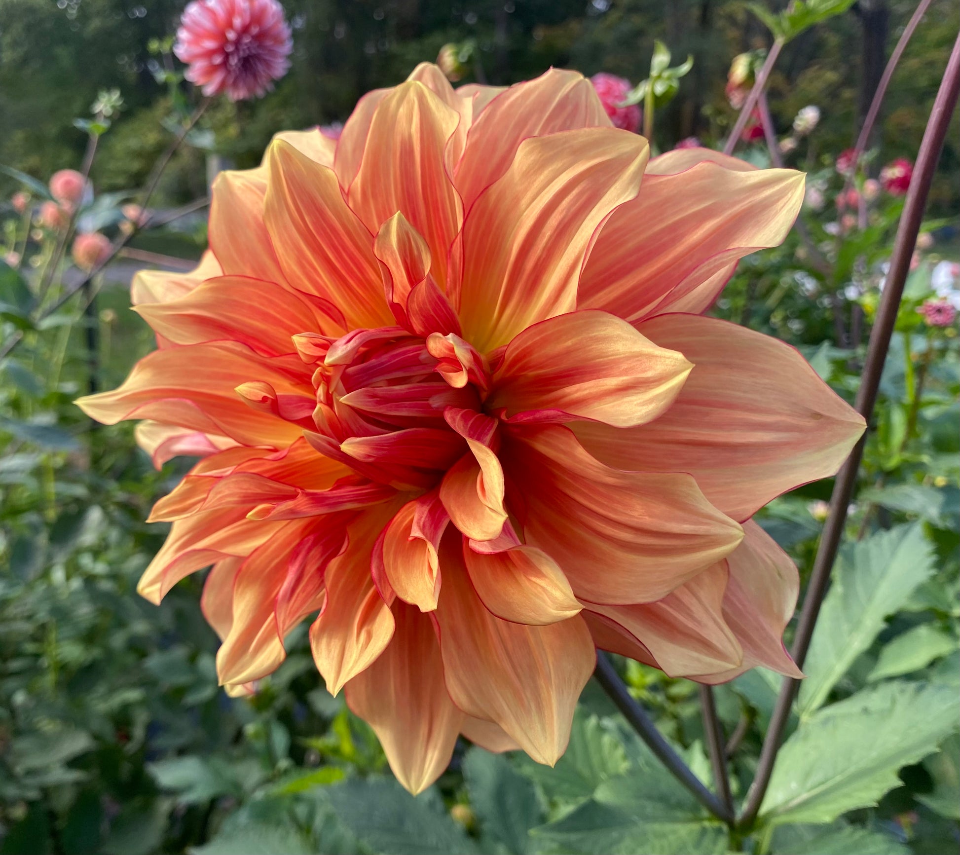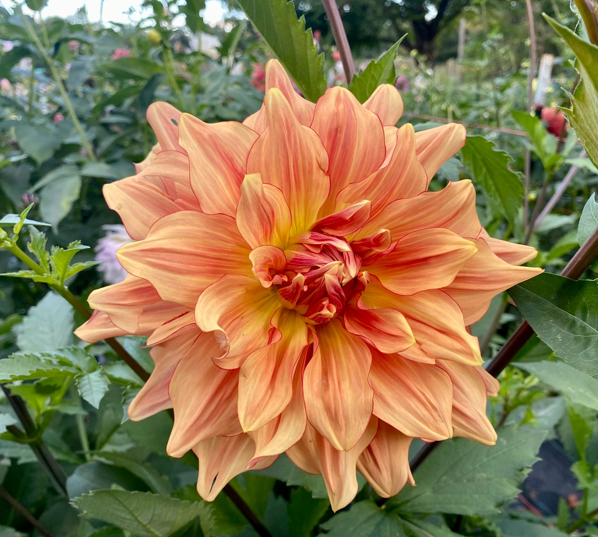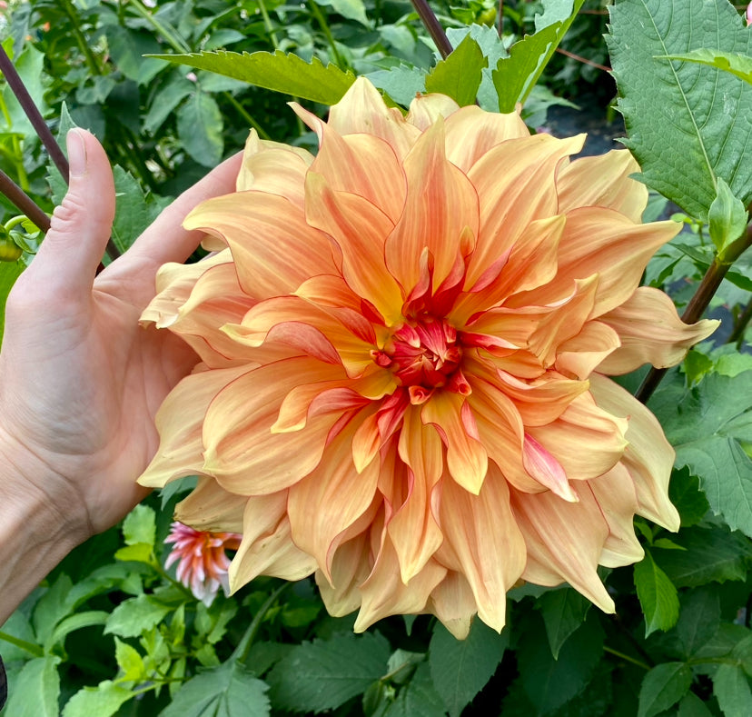 Pictures simply don’t do AC Murphy justice. Golden yellow-orange petals resemble sorbet surrounded with a raspberry “eyeliner” picotee edge with faintly raspberry-orange streaked petals on huge blooms. AC Murphy sparkles in the sunlight and quite literally leaves onlookers breathless. Excellent vase life for a giant dahlia.