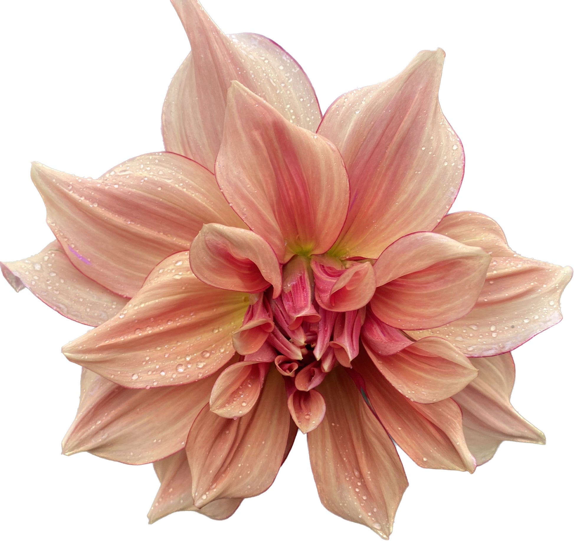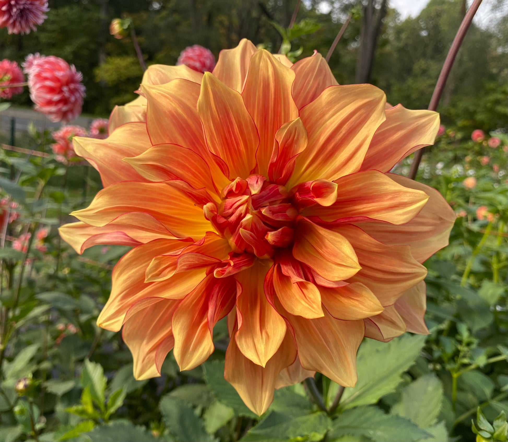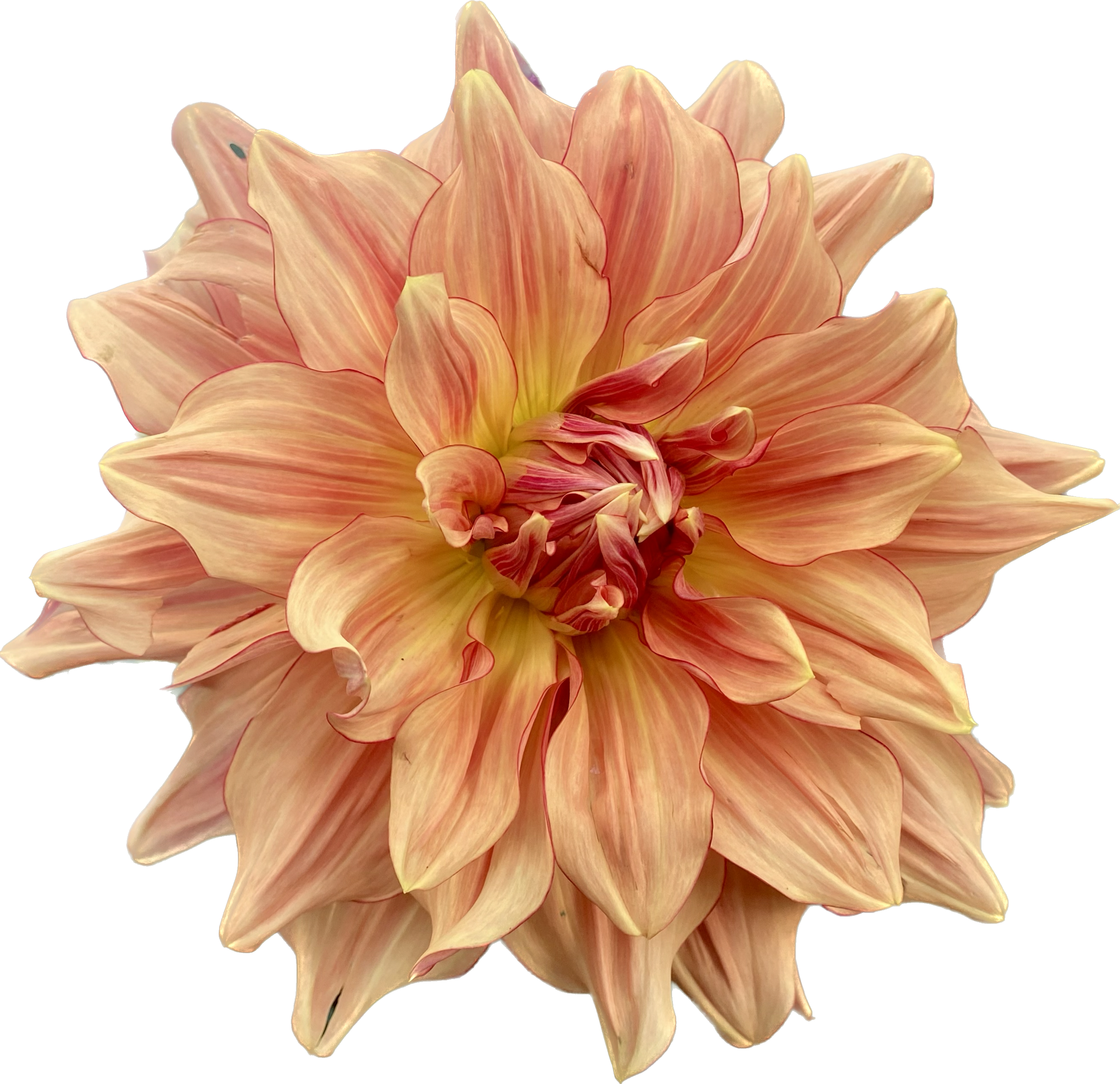 Pictures simply don’t do AC Murphy justice. Golden yellow-orange petals resemble sorbet surrounded with a raspberry “eyeliner” picotee edge with faintly raspberry-orange streaked petals on huge blooms. AC Murphy sparkles in the sunlight and quite literally leaves onlookers breathless. Excellent vase life for a giant dahlia.